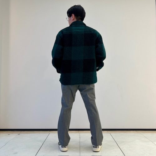 ・フリースとパンツで温かみのある季節感をだしつつ、