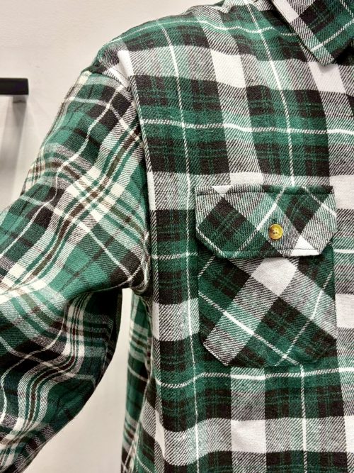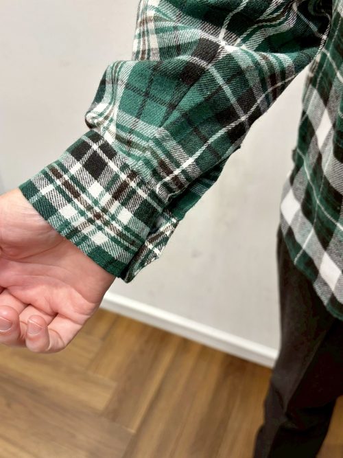 前身頃・襟・ポケット、後身頃・袖を2つの同色系ネルチェック生地で切替えた