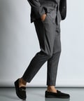 その生地にウールサージ調の柄をプリントし、まるでウールスラックスのような品のある表情を作り出しています。
