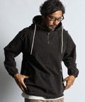 やや高めのスタンドネックのハーフジップ仕様で衿周りの収まりも良く、ゆったりとしたシルエットなので軽いアウター感覚で着まわしたくなる1枚。