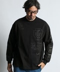 半ラバープリントを用い、DUFFERのアーカイブロゴを袖や身頃にまばらに配置したロングスリーブTシャツ。